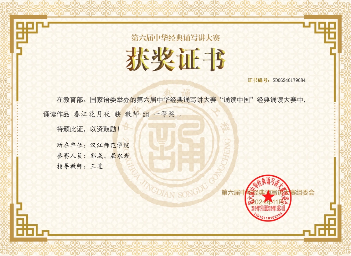 决赛中郭成、屈永岩两位老师朗诵的作品《春江花月夜》,是以月为主体,以江为场景,描绘了一幅幽美邈远、惝恍迷离的春江月夜图,创造了一个深沉、寥廓、宁静的境界,具有极高的审美价值。决赛现场,他们与来自中国传媒大学、苏州大学、东北师范大学等众多专业院校的教师同台竞技。面对来自专业院校的强劲对手,他们毫不畏惧,以饱满的热情和精湛的专业能力,深入挖掘作品中所蕴含的诗情画意和艺术魅力,最终荣获国家级一等奖的优秀成绩,这是我校首次获得此项荣誉。