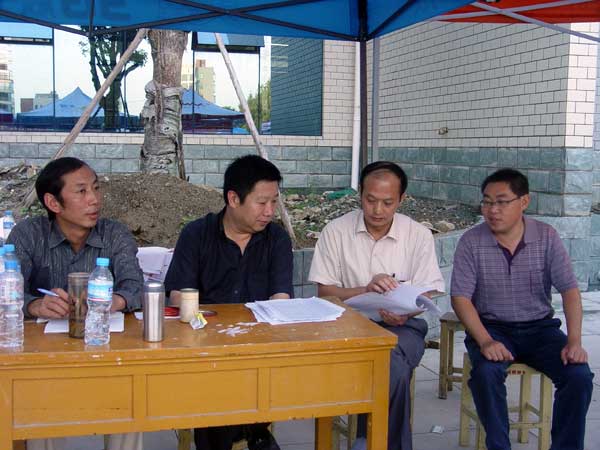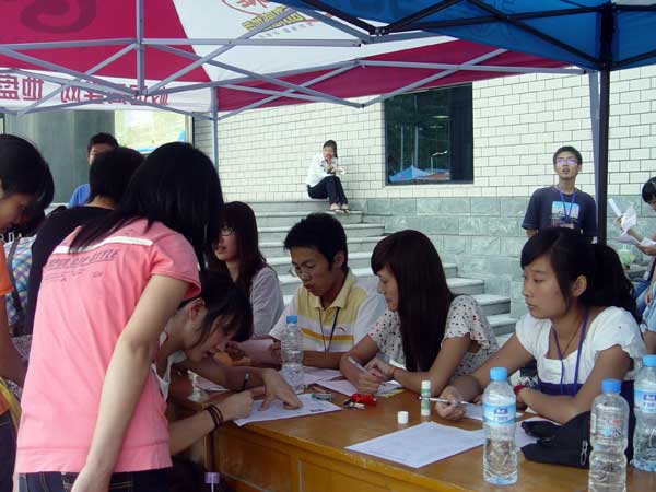 今天是迎新的最后一天。傍晚时分,当其他系的迎新点开始撤离的时候,我系迎新点工作依然在有条不紊的进行。有志愿者在整理新生报名表,有志愿者在耐心解答新生问题。此时,系领导班子跟他们一起,仍然坚守在迎新第一线。