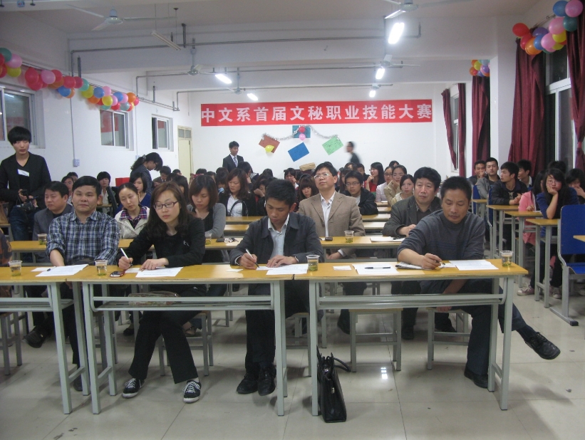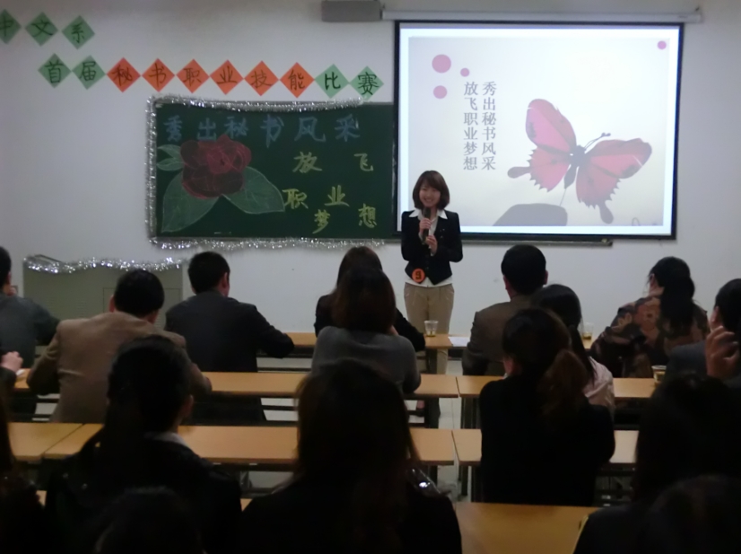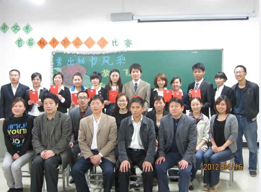 本网讯 通讯员 黄炜报道:4月16日晚7点半,由中文系主办、秘书教研室承办的主题为“秀出秘书风采 放飞职业梦想”的首届秘书职业技能比赛在文科楼B607隆重举行。来自中文系文秘、语教、播音主持三个专业的10名选手参加了比赛。最终,文秘1101班汪莉荣获一等奖;文秘2010、2011级王丽丽、吴丽君获得二等奖;文秘1001班陈苗、主播1001班冯政懿等七名同学分获三等奖和优秀奖。