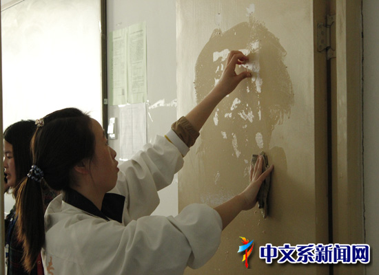 上午11时许,参与活动的相关人员在图书馆门前集合。成员们均拿着扫帚、拖把、抹布、小刀等工具,来到外语系所在的崇文A区7楼。到达目的地后,各小组成员迅速投入到已经分配好的任务中。在清洁的过程中,大家都很认真努力。地上粘着难以清除的口香糖,大家就用小刀一点点刮;墙上、门上贴着撕不掉的废纸,同学们就用湿抹布把纸沾湿后,用手一点点抠,墙上的脚印、墨迹也是大家用湿抹布、小刀一点点清除的。这个过程颇费时间和精力,但是大家丝毫没有倦怠。中文系资助工作委员会副主任王明更是亲自上阵,身体力行的为大家做榜样。他拿着拖把卖力的拖地,脸上依然挂着一贯的微笑,“劳动最光荣!”他的这句话感召了大家,更是令大家干劲十足。