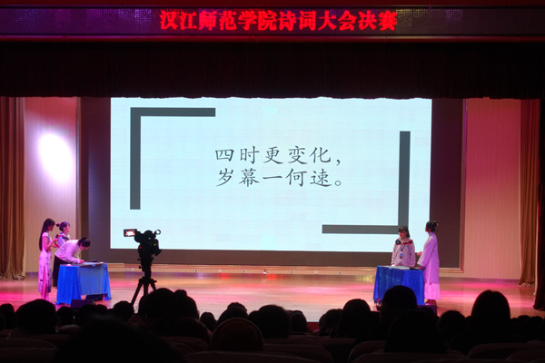 本网讯 通讯员周俞羊、文堉 周斌报道:经典滋润人生,诗词传承文明。11月30日晚,南风剧场内古典音乐悠扬婉转,众多学子吟诗作答,全场沉浸在中华古典诗词的无穷魅力中,这是汉江师范学院2019年中华诗词大会的决赛现场。来自全校各学院16名优秀选手齐聚一台,以扎实的文化功底赢得现场一阵阵喝彩。