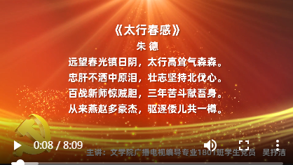 日前,经过多日筹划的第一期微党课上线。为深入开展党史学习教育,把学习教育与专业相结合,amjs澳金沙门线路首页党总支策划了系列讲党史故事、赏红色诗词活动。学生一、二党支部首批组织了5名优秀学生党员,来赏析5篇革命诗词。这里发布的是吴抒洁同学赏析《太行春感》(朱德)()。