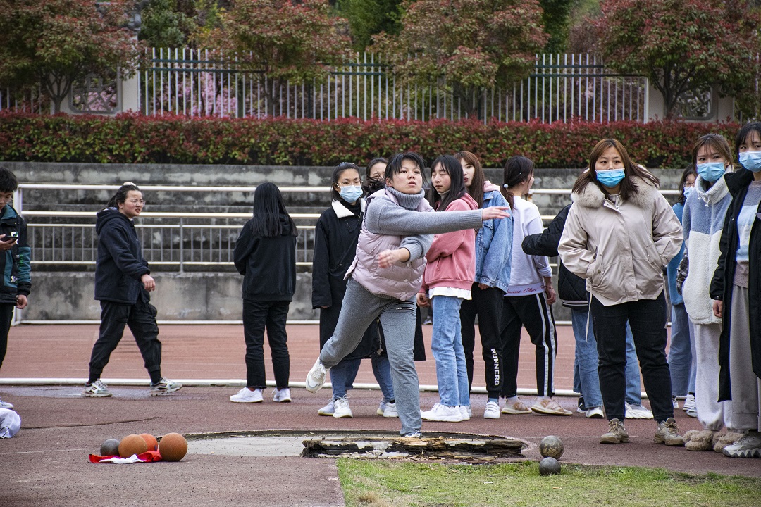 铅球场上,铅球在运动员手中以完美的弧度落地。