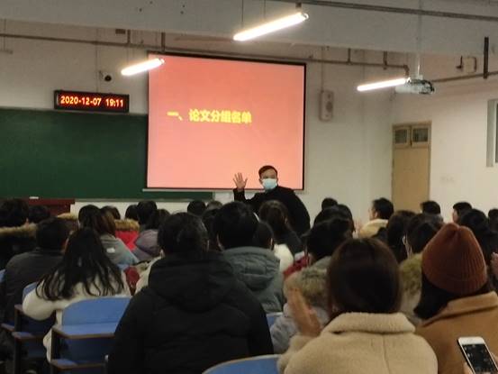 吴海燕老师宣读论文指导老师和学生分组名单后,赵崇璧副院长提出了关于论文写作的具体要求:一是选题要适度;二是选题要有针对性;三是论述角度要有时代性;四是论点结论不应是“无意义的废话”;五是避免教科书式的思维框架;六是应讲思辨逻辑而不是“不讲理”。