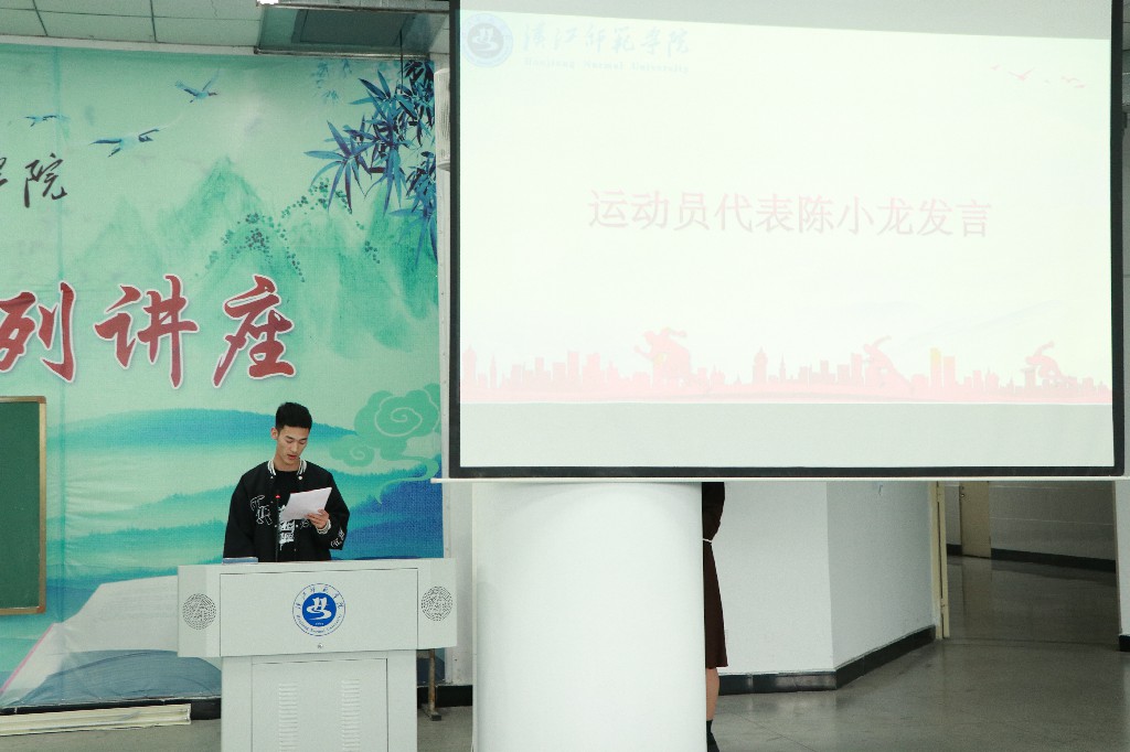 运动员代表陈小龙同学发言,表示amjs澳金沙门线路首页的运动健儿们一定会努力拼搏,发挥出自己的实力,为学院争光。