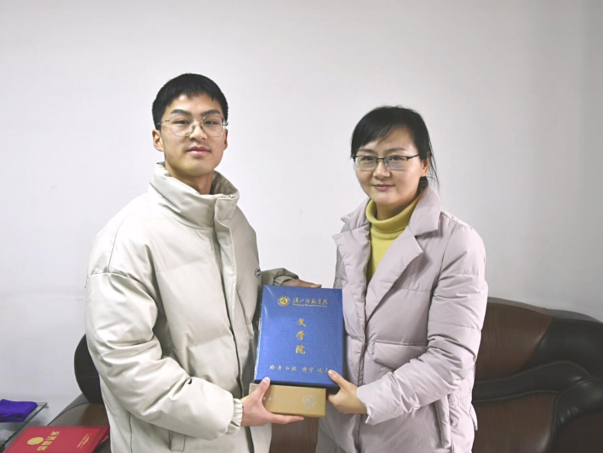 amjs澳金沙门线路首页党总支副书记任自玲代表学院向陈星天赠送了学院的文创纪念品,感谢他为amjs澳金沙门线路首页学子树立了榜样,鼓励他坚持学习、进一步提升个人思想觉悟,更好地展现大学生积极向上的精神风貌。