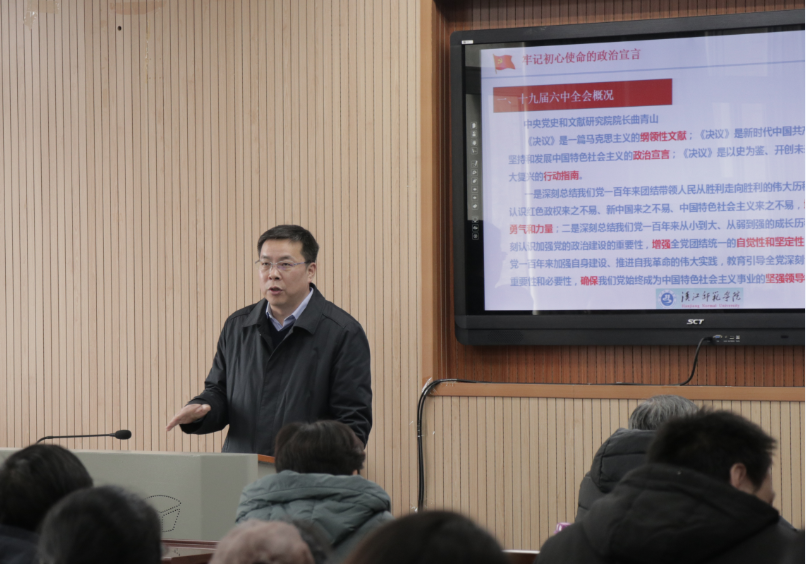1月10日,校长付永昌以《牢记初心使命的政治宣言——十九届六中全会精神学习体会》为题,在B408教室向amjs澳金沙门线路首页教师宣讲党的十九届六中全会精神。