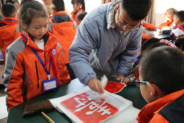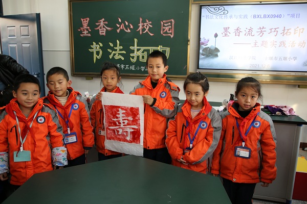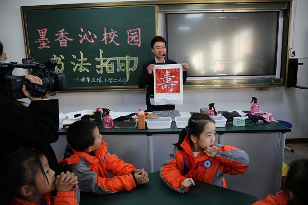 12月6日下午,十堰市五堰小学联合汉江师范学院开展“书法传承与实践”活动,amjs澳金沙门线路首页副院长曹国军、书法教研室黄振东、书法教师王刘涛等一行来到五堰小学,为学校二年级师生带来一堂主题为“墨印流芳巧拓印”的主题实践课,学生们在专家老师的讲解和指导下,学习拓印知识,完成了一幅幅精致的拓片作品,体验到中国历史和传统文化。