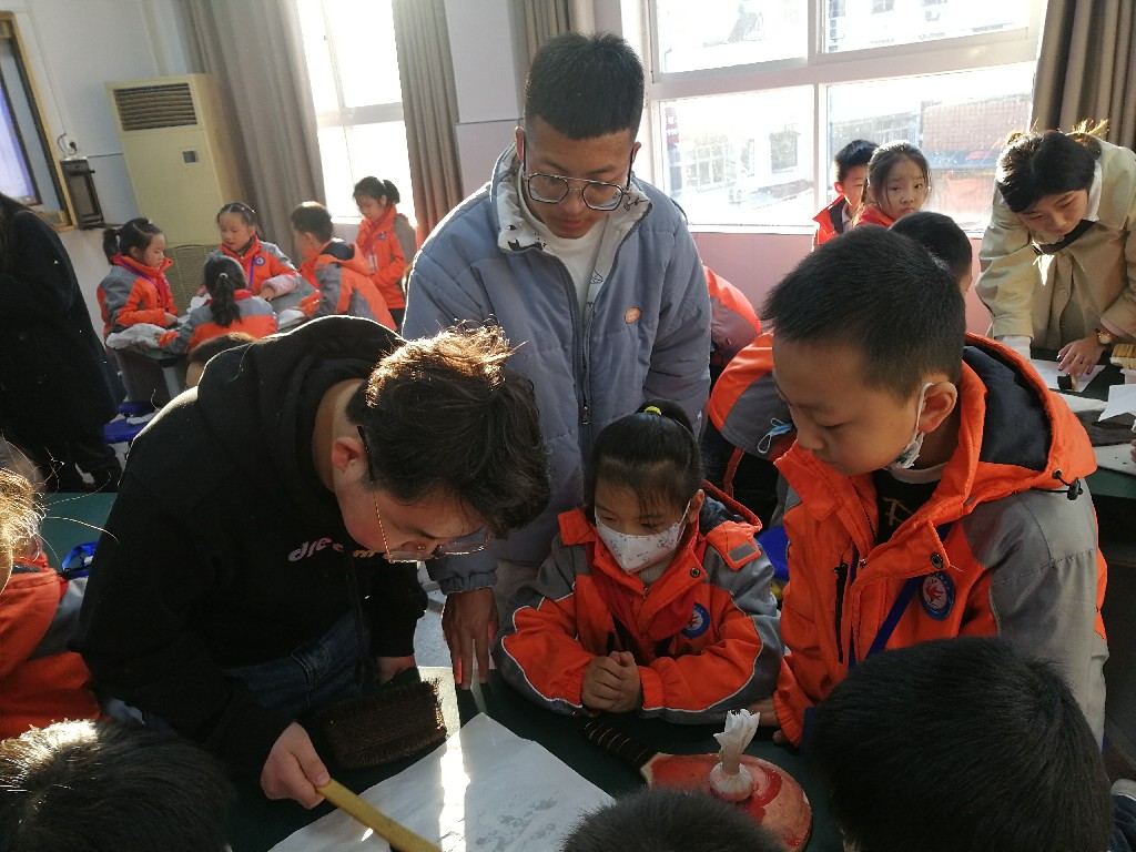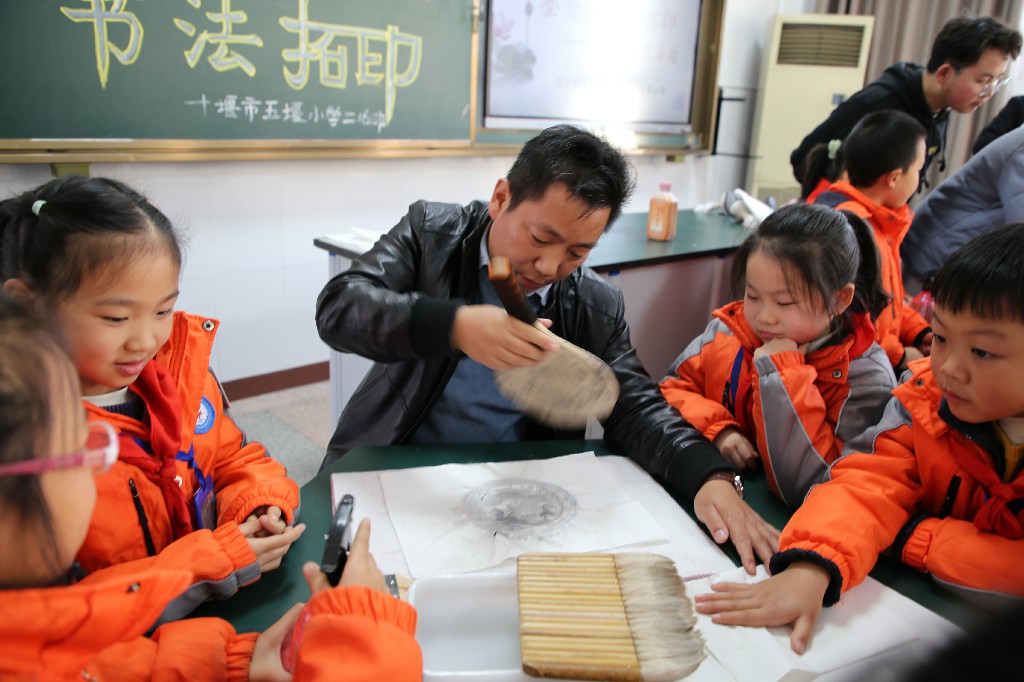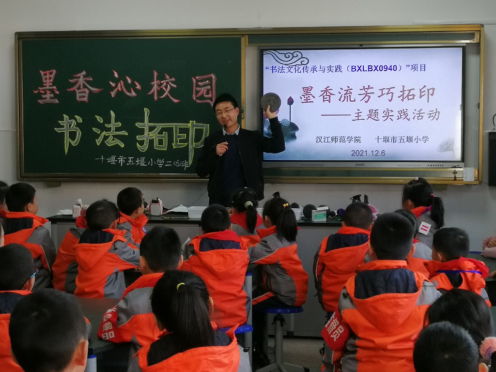 应十堰市五堰小学邀请,12月6日下午,书法教研室教师曹国军、黄振东、王刘涛带领3名学生前往该校开展了一场“墨香流芳巧拓印”的主题实践活动,受到五堰小学领导、老师和学生的热烈欢迎。
