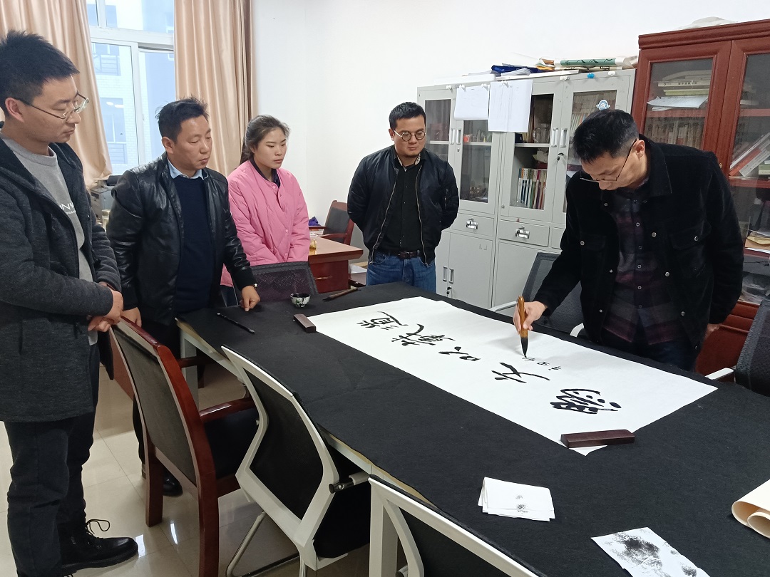 讲座开始前,刘博士还在崇文楼B509与书法教研室的老师们开展了书法教学与科研座谈,点评了部分书法学专业学生的印章、书法作品,并为amjs澳金沙门线路首页书法教研室题字。