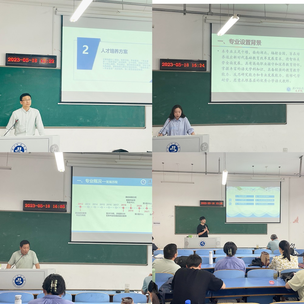 汉语言文学专业负责人贾君芳、小学语文教育专业负责人袁丽、书法学专业负责人黄振东、广播电视编导和网络与新媒体专业负责人杨思宇等4名老师围绕专业设置背景、人才培养方案、师资队伍建设情况、实验实训条件、教学管理体系和机制、专业特色与创新等六个方面阐述了各自专业建设成绩与经验、问题与不足以及今后的发展思路,深入分析了专业人才培养模式构建,各专业的核心课程、核心能力,师资建设等内容。
