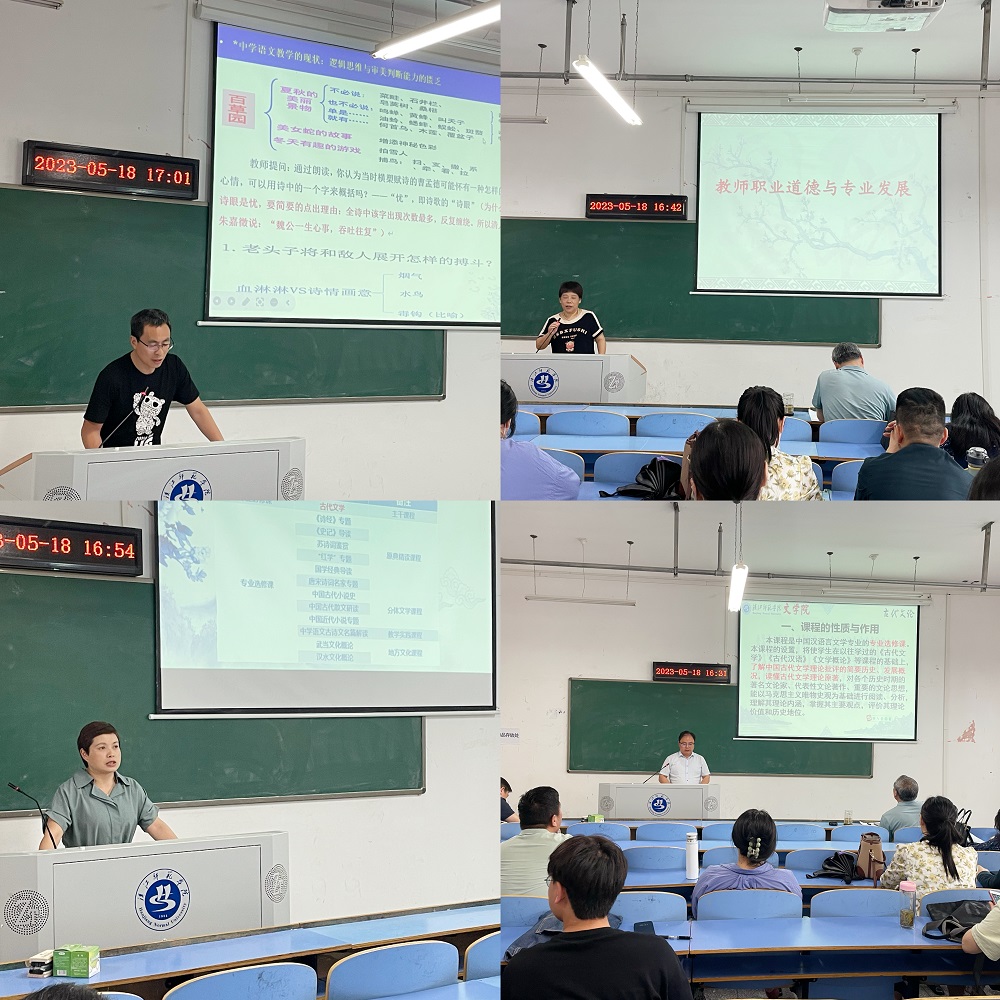 副院长赵崇璧、语文课程与教学论教研室主任龙湘玲、古代文学教研室主任李芬兰、文艺理论及外国文学教研室主任龚道臻等4名教师分别围绕课程对人才培养目标、毕业要求、学校定位的支持度、课程在培养方案课程体系中的定位、课程OBE教学改革实施情况、课程思政实施情况、课程教学设计观摩、课程资源建设等六个方面对自己所教授的课程进行了详细的介绍。