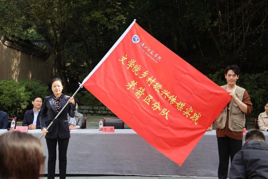茅箭区茅塔乡东沟村作为本次传媒实践活动的代表基地,汉江师范学院副校长吴冰为其授牌。随后,对9个实践分队进行了活动授旗仪式。