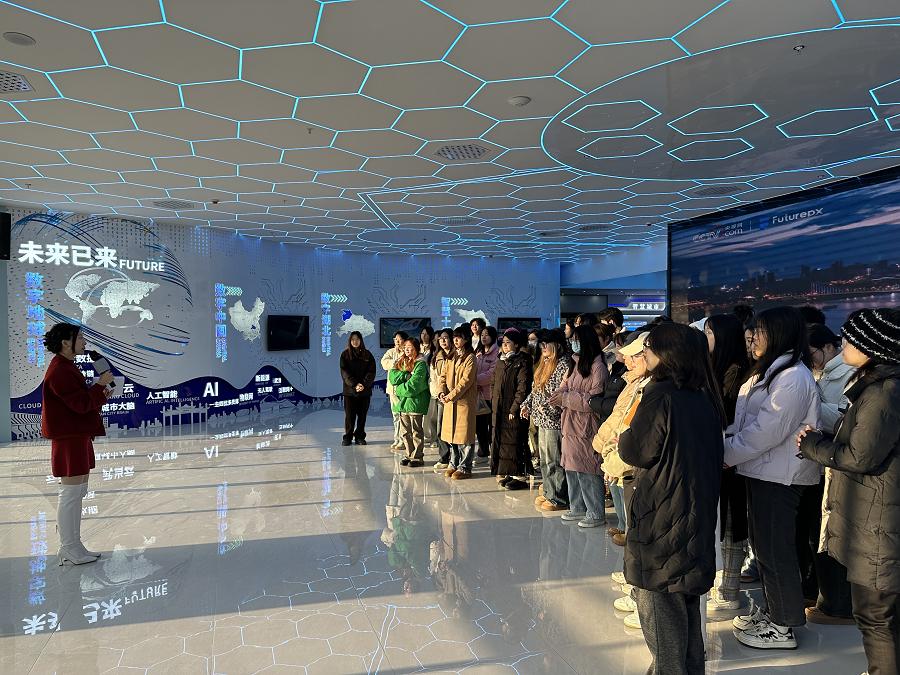 参观完产业园后,十堰大数据运营有限公司代表肖盛宁从“智慧城市”建设背景、公司概况、项目合作、未来规划做了具体介绍。十堰数字经济产业园代表王珊从成立背景、发展现状、后期规划介绍了产业园的建设规划情况,加深了学生们对以数字经济为核心,打造集“低碳发展示范区+总部经济园区+高新企业孵化基地+武当云生态区+金融科技园区+电商物流园区+华为数字经济创新中心+数字经济产业联盟生态圈”为一体的专业型功能园区的认识。人民日报数字传播代表段浩对人民日报数字传播做了介绍,并欢迎学生们到此实习。