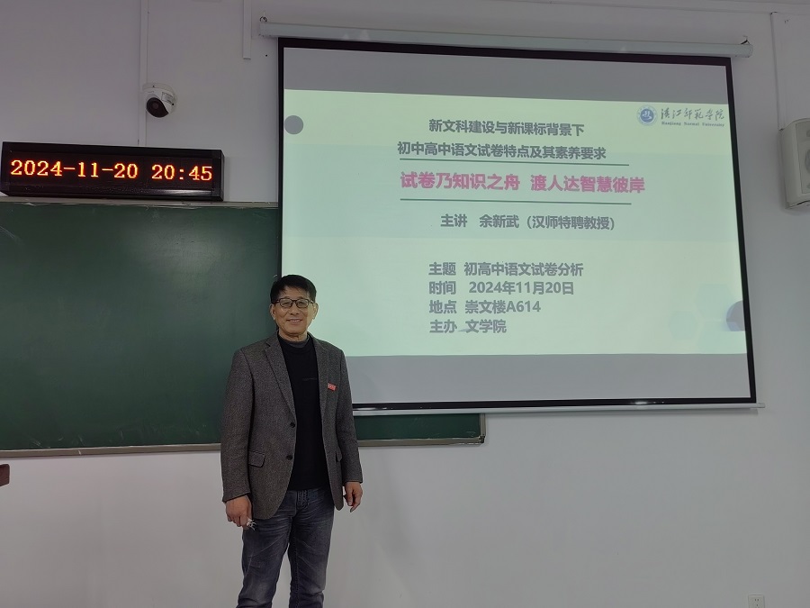 11月20日19时,我校外聘专家、湖北师范大学余新武教授莅临我院,于崇文楼A614作“试卷乃知识之舟,渡人达智慧彼岸”的专题讲座。本次讲座由教研室主任龙湘玲主持,语文课程论教研室的尹珩、章文婧老师及汉语言2022级、2024级160名学生共同参与。