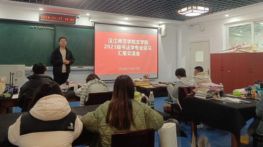 11月17日晚,amjs澳金沙门线路首页2023级书法学专业在崇文楼召开专业见习汇报交流会,书法教研室主任黄振东老师出席,班主任王刘涛老师主持会议。