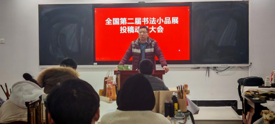 12月22号晚,书法学专业全体学生齐聚崇文楼b505,参加全国第二届小品展投展动员会。出席会议的有曹国军教授、黄振东老师、高常老师、王刘涛老师、张晗老师。会议由黄振东老师主持。