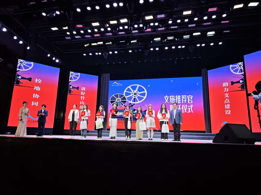 活动首先揭晓"校园文旅推荐官"活动的获奖名单,并由张晨和陈必明为魏梦倩、雷依雪、杨茗铄、钱文莉、李萌、王青雅、周思琪等7位获奖学生颁发校园文旅推荐官聘书。