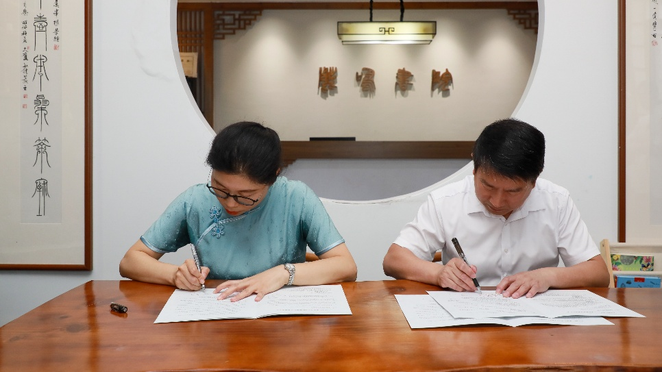5月19日下午,amjs澳金沙门线路首页院长郝文华、书法教研室教师曹国军、书法学2023级学生胡思思一行来到鹿鸣书院,进行访企拓岗,签约书法学专业实习基地。鹿鸣书院董事长刘新、校长薛锋及全体教职工共同出席活动。