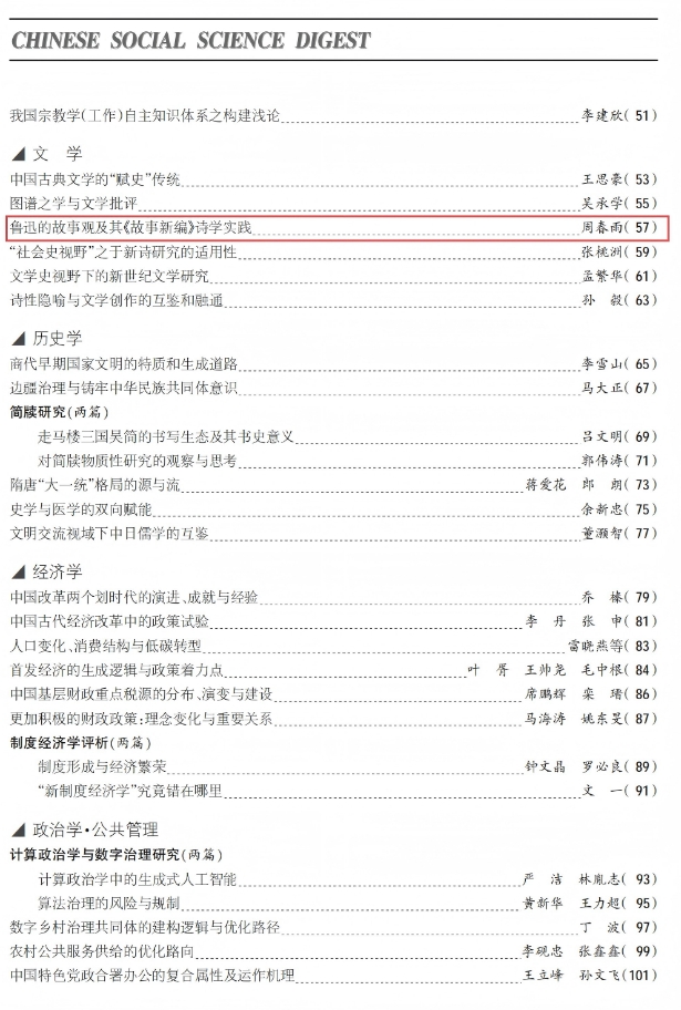 《中国社会科学文摘》2025年第4期“文学”栏目全文转载amjs澳金沙门线路首页教师周春雨的学术论文《鲁迅的故事观及其<故事新编>诗学实践》。该文是同期被转的一篇来自地方院校青年学人的学术成果,原文发表在《华中学术》2024年第4期。