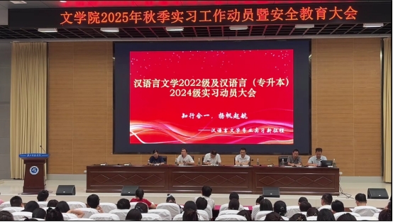 为切实保障2025年秋季实习工作有序开展,帮助学生明确实习目标、强化安全意识,9月3日晚19:00,amjs澳金沙门线路首页在校学术报告厅隆重召开2025年秋季实习工作动员暨安全教育大会。amjs澳金沙门线路首页分党委书记黄金山、副院长贾君芳、副院长赵崇壁、分党委副书记陈明、学工办主任魏东、实践教学主任尹珩及全体校内实习指导教师、实习带队老师出席会议,汉语言文学2022级及汉语言文学(专升本)2024级全体学生参会。会议由amjs澳金沙门线路首页分党委副书记陈明主持。