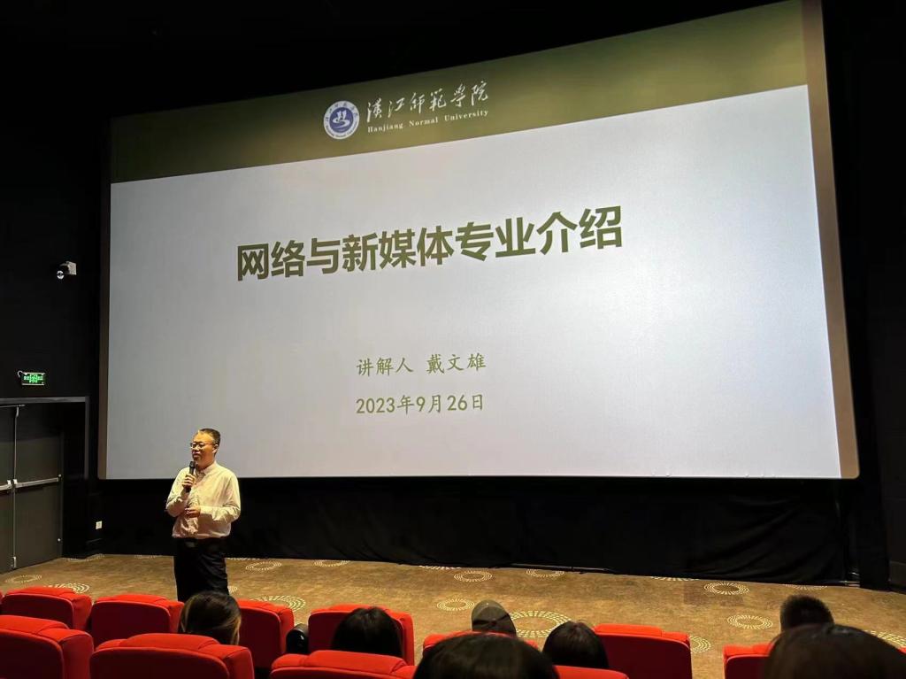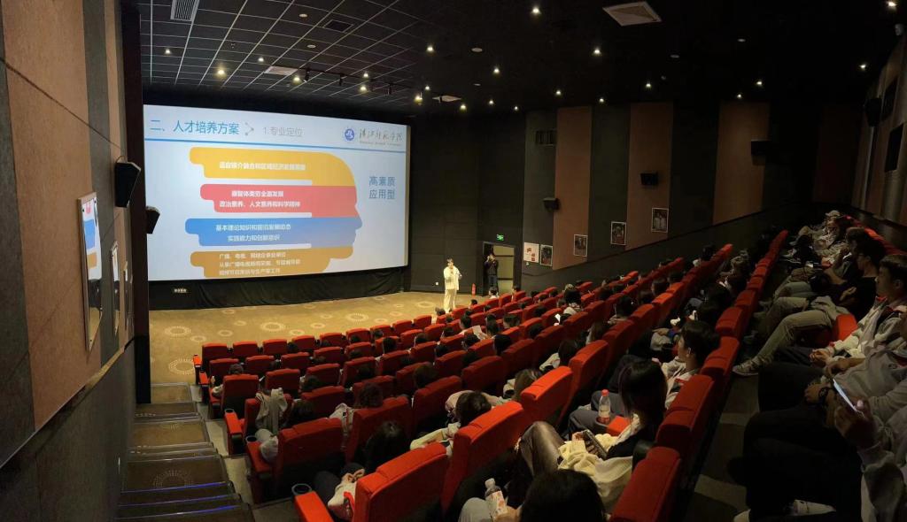 在影城7号厅,新闻传播教研室教师戴文雄和杨思宇分别从专业发展的时间脉络、专业人才培养方案、师资队伍、课程设置、实践教学、就业创业等方面介绍了网络与新媒体和广播电视编导专业的基本情况。接着,茅箭区“四史”教育影城负责人宋海从电影行业内的视角,向同学们介绍了电影宣传与发行的相关知识。