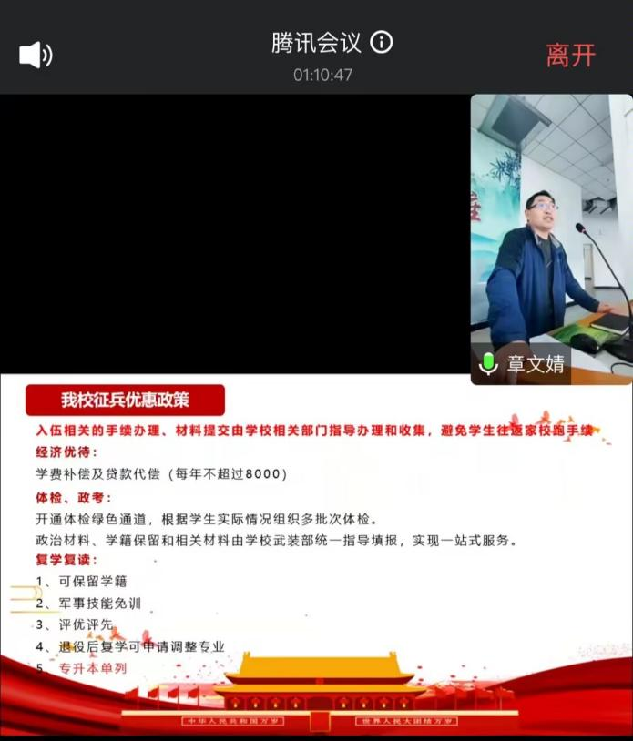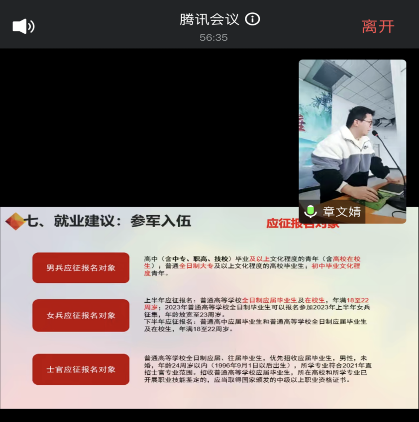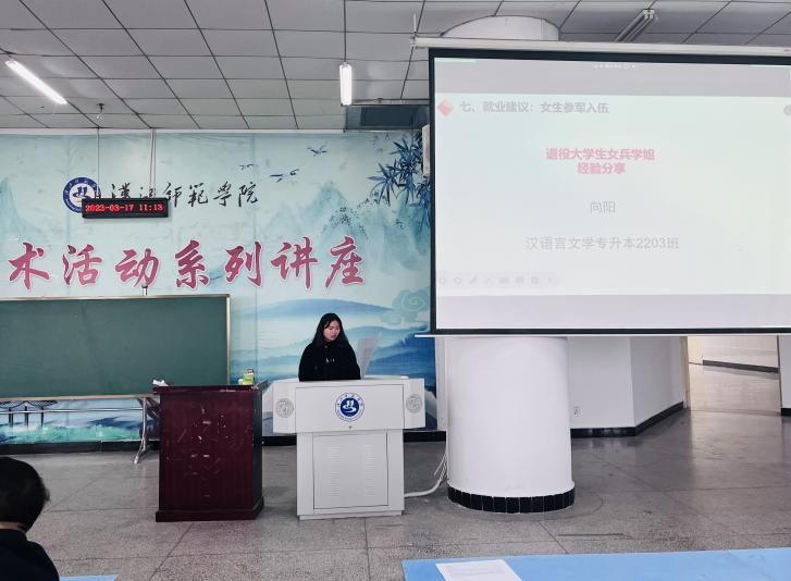 语教专业辅导员蔡兆祝老师为同学们进行了关于征兵入伍优惠政策以及报名应征等一系列内容的讲解。为了让同学们了解得更加深入,amjs澳金沙门线路首页还邀请了原17级语教专业、现2022级汉语言专业的退伍大学生向阳同学来进行经验交流。向阳同学分享了自己入伍前后的全过程和在部队中主要从事的工作内容,以及在校入伍的优势,向同学们证明参军入伍是一项光荣的事业,对大家今后的升学就业也有极大帮助。