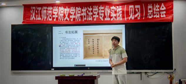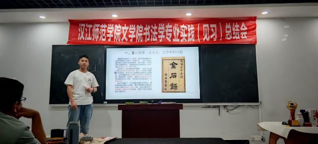 本次研学考察总结大会以考察途中参观的书法尺牍、文武实体、金石拓片为主要研究对象,以小组为单位,分工明确,派代表上台陈述,时间上限为十分钟。同学们各抒己见,将沿途见闻与专业知识紧密结合,气氛热烈。兰文达同学从吴门书派和书法刺绣的角度出发,讲到王宠和祝允明书法的特点,并且对比了祝允明和文征明的小楷作品,反映了其文字结构疏密相间的特点。潘中成同学以金石文化和明清篆书为主,描述篆书的发展与脉络,并且结合自己对明清篆书流派的认识,表达了自身的理解和感悟。