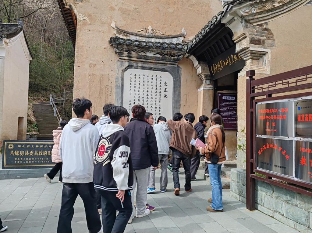 接下来,专线车队正式启程,开启全天研学之旅。研学首站为忆乡坪,师生们通过“薪火传递”等团建活动,在农耕文化体验中感悟协作精神。第二站为均郧房县委旧址,土墙与陈列的历史物品,再现了革命的峥嵘岁月。第三站为秦巴植物园,师生们漫步于樱花盛开的生态园,共同描绘春之画卷。