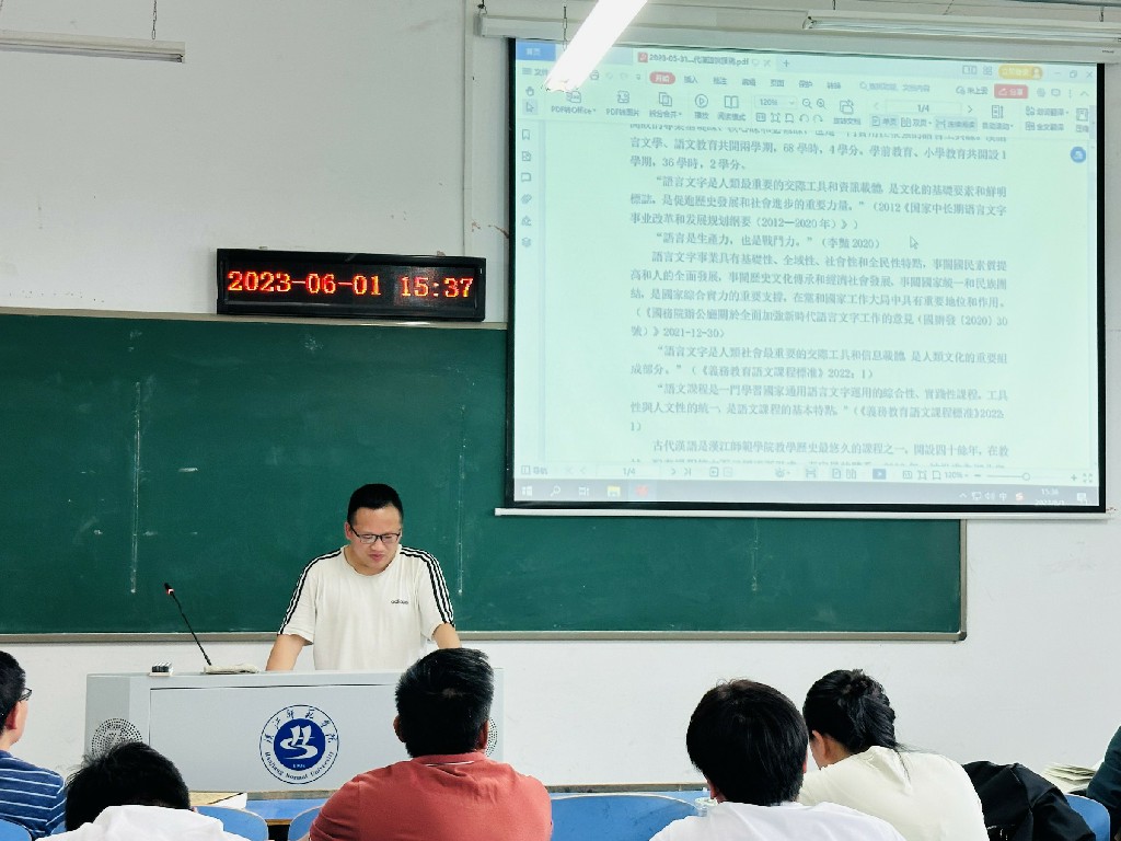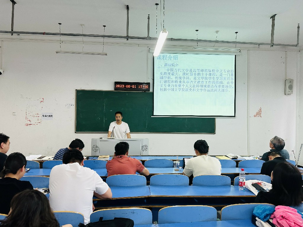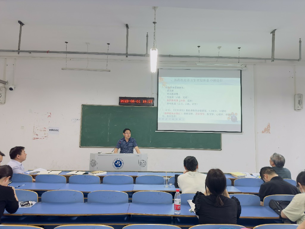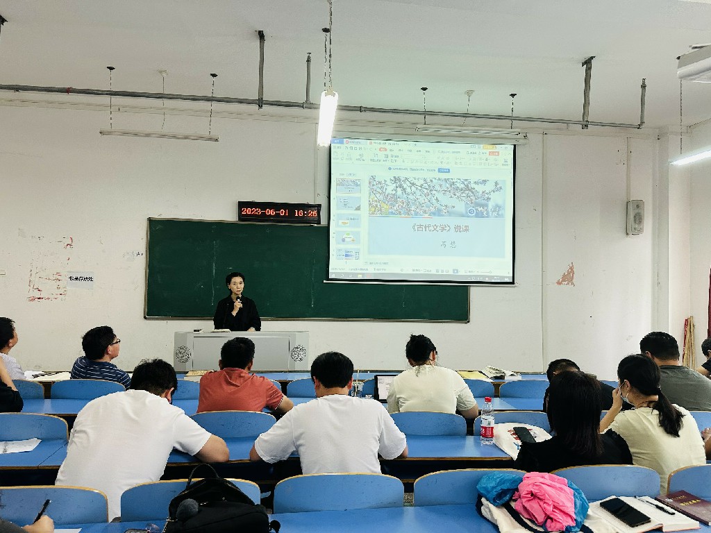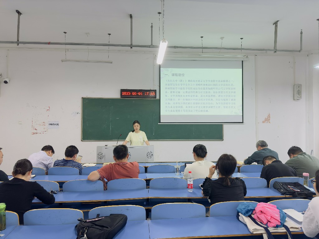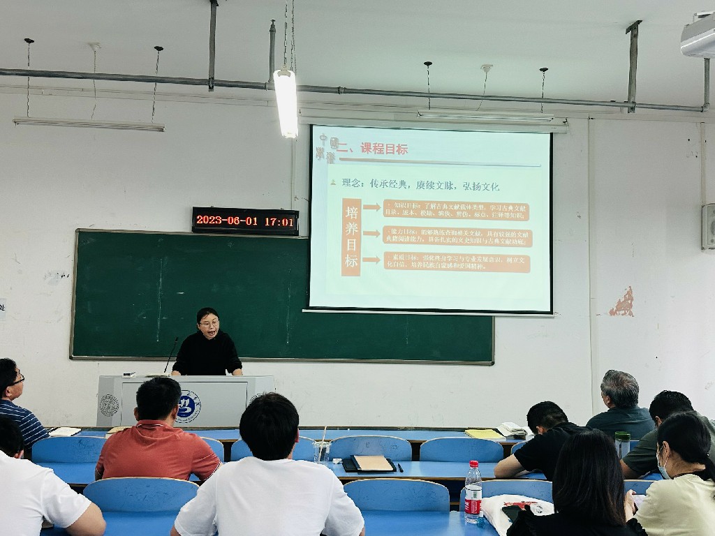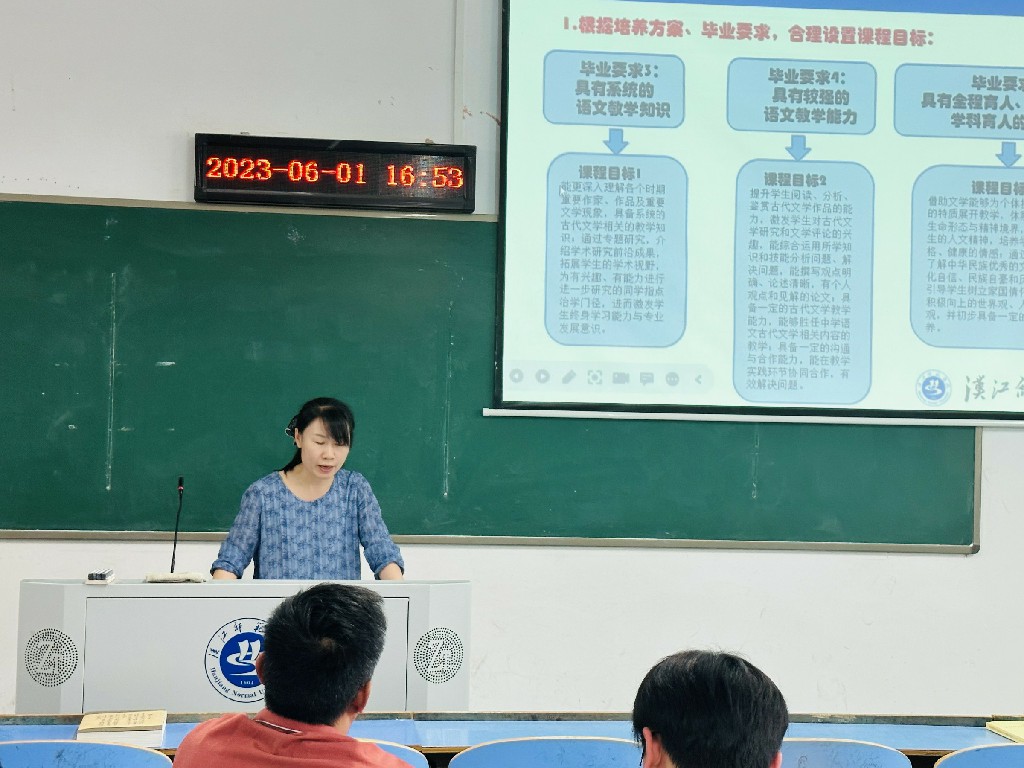副院长、书法教研室专任教师曹国军,汉语教研室专任教师付开平、陈洁、江艳丽、王丹,古代文学教研室专任教师李洪、葛慧、饶艳、王艳、杨慧,文艺理论及外国文学教研室专任教师杨波、徐春、王磊等13名教师分别围绕课程对人才培养目标、毕业要求、学校定位的支持度、课程在培养方案课程体系中的定位、课程OBE教学改革实施情况、课程思政实施情况、课程教学设计观摩、课程资源建设等六个方面对自己所教授的课程进行了详细的介绍。
