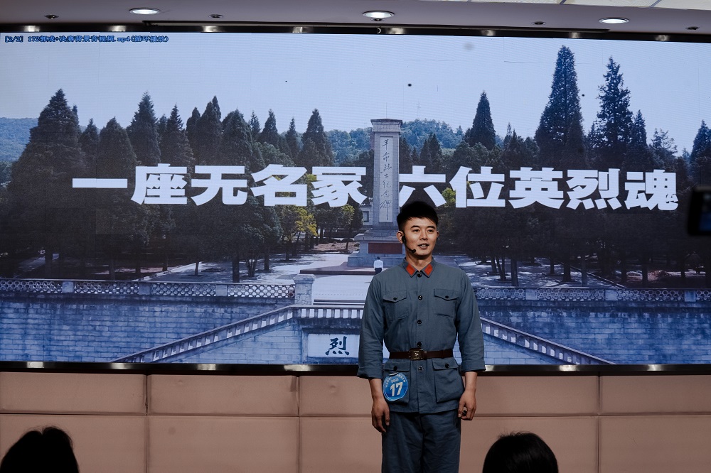 郭成老师历经自主命题讲解、随机命题讲解、社会科学常识测试等环节,一路过关斩将。在自主命题讲解环节,他以《一座无名冢六位英烈魂》为主题,身着一袭红军装,化身“男主角”,用第一人称演绎了6位没有姓名、没有生平的红军烈士92年前在武当山的英勇事迹,讲述了今天当地人民挖掘红色资源,弘扬红色革命精神,传播红色文化的真实故事。