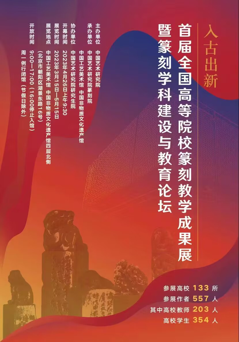 本次展览是由中国艺术研究院主办,中国艺术研究院篆刻院、中国工艺美术馆和中国非物质文化遗产馆联合承办,中国艺术研究院研究生院协办,参展高校共有133所,参展作者共计557人(高校教师203人,高校学生354人)。