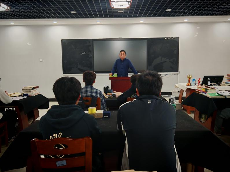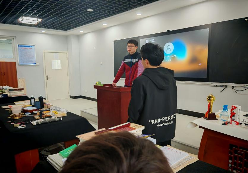 接着,龚官雨校友详细讲述了第十三届国展入展的心得体会,并且分享了入展作品的书写技巧和章法构思;提出书法创作要注重书写空间的对比感、字法的灵活融合和落款的多样形式,对书法未来发展道路和方向提出了自己的看法和建议。