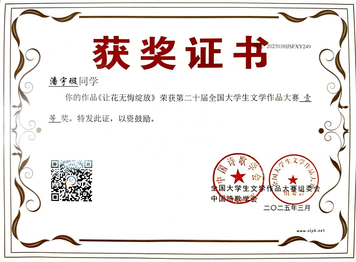 近日,第二十届全国大学生文学作品大赛获奖名单公布,我院学子表现优异,共有263人获奖,其中一等奖10名,二等奖100名,三等奖153名。获奖作品涵盖小说、散文、诗歌等多类体裁,展现学子扎实的创作功底与多元的艺术探索。amjs澳金沙门线路首页长期推行"以赛促学"创新培养模式,有效提升学生文学创作能力。此次赛事由国家一级学会指导,湖北省散文学会承办,amjs澳金沙门线路首页学子在全国千所高校参赛者中脱颖而出,既是对amjs澳金沙门线路首页教学的肯定,也彰显了学校在人文教育领域的深厚积淀。