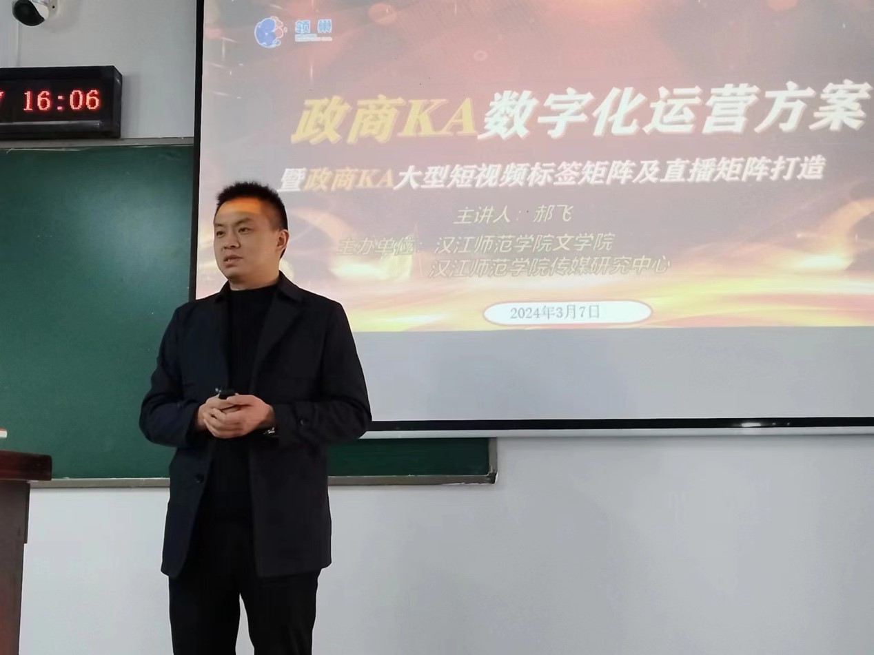 为促进amjs澳金沙门线路首页传媒专业学生了解产业前沿动态,凸显专业产教融合培养模式,3月7日下午,湖北光迅文化传媒有限公司创始人郝飞总经理一行应邀为网络与新媒体和广播电视编导专业的2023级同学开展《政商KA数字化运营方案》的专题讲座。讲座由新闻传播教研室主任戴文雄老师主持。